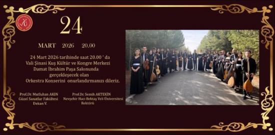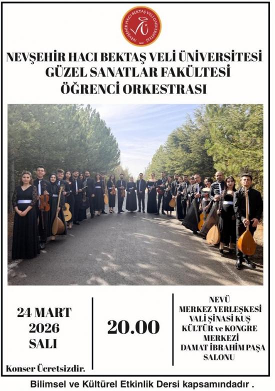 Nevşehir Hacı Bektaş Veli Üniversitesi Güzel Sanatlar Fakültesi Sahne Sanatları Bölümü/ Müzik Ana Sanat Dalı tarafından yapılacak olan etkinlikte ‘ Güzel Sanatlar Fakültesi Öğrenci Orkestrası’ sahne alacaktır.